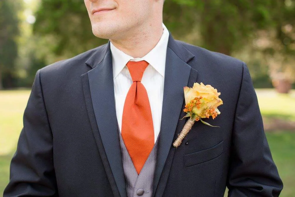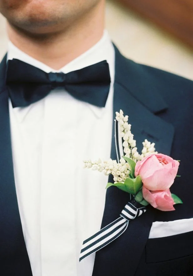 In other instances, you can use boutonnieres to bring in a color on the groom's tux or suit that isn't present, such as an accent color. This is especially useful if your groom isn't all that into more feminine colors such as pink or purple. However, he can surely live with a small pink boutonniere on his lapel!