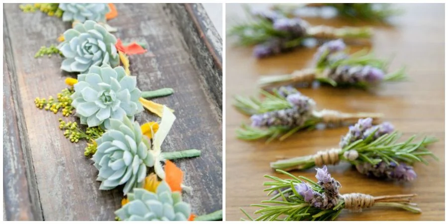 Boutonnieres are a great place to try something a little different and out of the box to carry through your wedding theme. We just love the idea of using succulents to make a bold, monochromatic statement. Also, there is something to be said for the simplistic beauty of lavender.